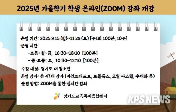 KPSNEWS 김채경 기자 | 경기도교육복지종합센터가 도내 청소년을 대상으로 ‘2025년 제4기 학생 온라인(ZOOM) 강좌’를 운영한다.