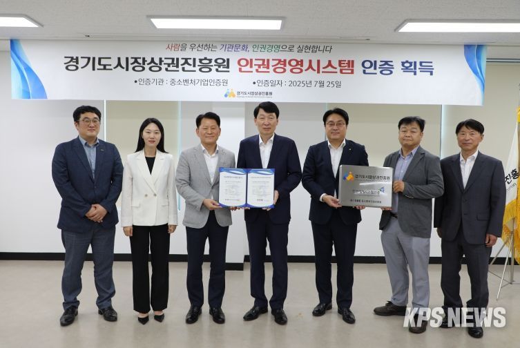KPSNEWS 김채경 기자 | 경기도시장상권진흥원은 최근 중소벤처기업인증원의 ‘인권경영시스템 인증’을 획득하고 18일 양평군 본원에서 인증서 수여식 및 현판식을 열었다고 밝혔다.