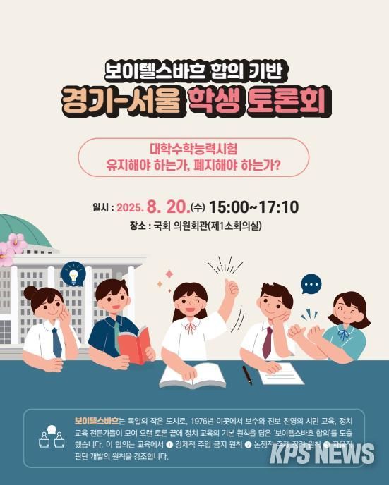 KPSNEWS 김채경 기자 | 경기도교육청이 20일 서울특별시교육청 국회 교육위원장 김영호 의원과 함께 ‘보이텔스바흐 합의 기반 경기-서울 학생 토론회’를 공동 개최한다. 학생들에게 보이텔스바흐 원칙을 바탕으로 교육을 포함한 정치·사회 분야에 적극적인 토론 기회를 제공하고자 마련한 자리다.