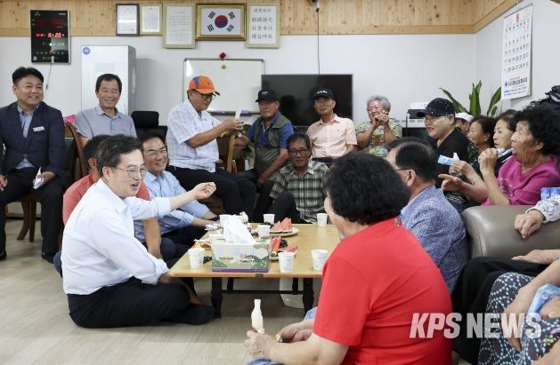 KPSNEWS 김채경 기자 | 김동연 지사가 탑승한 ‘달달버스’가 TOK 평택 포승공장 착공식을 마치고 달려간 곳은 포승읍 내기1리 무더위 쉼터. 1층 거실에 어르신 30여 명이 김동연 지사를 맞이했다.