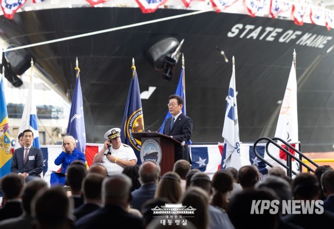 KPSNEWS 김채경 기자 | 이재명 대통령은 26일(현지시간) 오후 미국 필라델피아에 위치한 한화 필리조선소를 방문해 미국 해양청이 발주한 국가안보다목적선 '스테이트 오브 메인'호의 명명식에 참석했다.