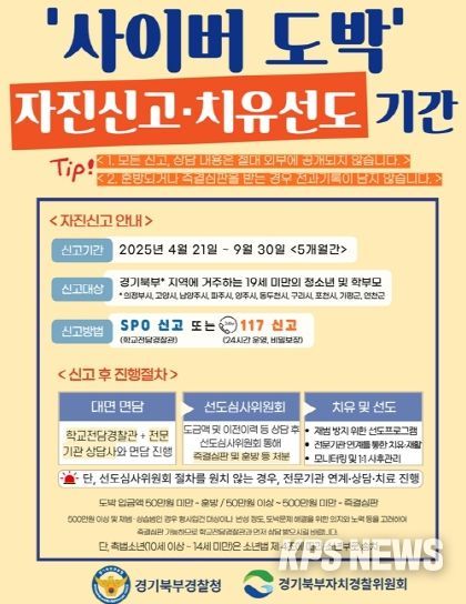 자진신고 대상은 경기북부 지역에 거주하는 19세 미만 청소년 및 학부모이며, 신고접수는 학교전담경찰관(SPO) 또는 117 청소년 신고센터(24시간 운영)를 통해 가능하다.
