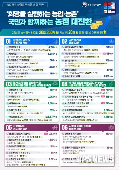 KPSNEWS 김채경 기자 | 농림축산식품부는 2026년 예산안을 전년 대비 6.9%(1조 2,934억원) 증가한 20조 350억원 규모로 편성했다고 밝혔다.