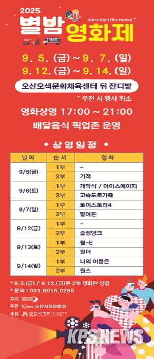 KPSNEWS 김채경 기자 | 오산시는 오는 9월 5일부터 9월 14일까지 매주 금·토·일 저녁, 오산천(오색문화체육센터 뒤편)에서 시민들이 야외에서 영화를 즐길 수 있는 '2025 제3회 오산천 별밤영화제'를 개최한다고 밝혔다.