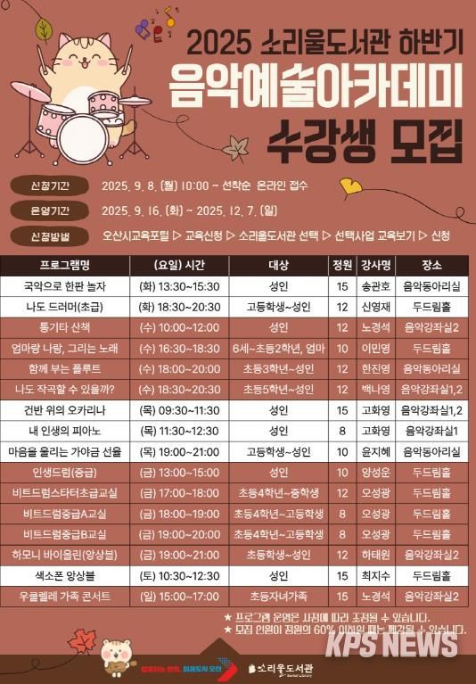 KPSNEWS 김채경 기자 | 경기도 오산시 소리울도서관은 시민들이 음악의 즐거움을 직접 체험할 수 있는 『2025 소리울도서관 하반기 음악예술아카데미』를 운영하며, 오는 9월 8일부터 수강생을 모집한다고 밝혔다.