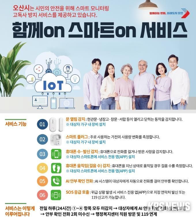 KPSNEWS 김채경 기자 | 오산시는 9월부터 관내 고독사 위험 시민들의 사회적 고립을 해소하고 고독사 예방을 위해 사물인터넷(IoT) 기반 디지털 모니터링 서비스인 ‘함께on 스마트on 서비스’를 운영한다고 밝혔다.