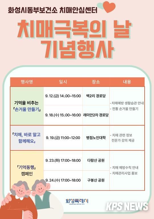KPSNEWS 김채경 기자 | 화성시동부보건소가 제18회 치매극복의 날을 맞아 12일부터 24일까지 치매 예방과 인식 개선을 위한 기념행사를 운영한다.