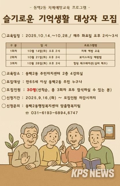 KPSNEWS 김채경 기자 | 용인특례시 기흥구 동백2동은 10월 14일부터 28일까지 3주간 진행하는 치매 예방 프로그램 ‘슬기로운 기억생활’ 참여자를 모집한다고 22일 밝혔다.