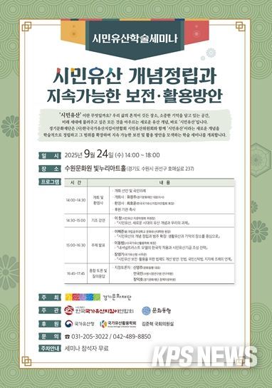 KPSNEWS 김채경 기자 | 경기문화재단은 오는 10월 24일 오후 2시, 수원문화원 빛누리아트홀에서 ‘시민유산 개념정립과 지속가능한 보전·활용방안’ 학술 세미나를 개최한다고 밝혔다. 세미나는 문화유산을 소수 전문가의 영역에서 시민 모두의 유산으로 확장하고, 그 가치를 지속가능하게 보전, 활용하는 방안을 모색하기 위해 기획됐다.