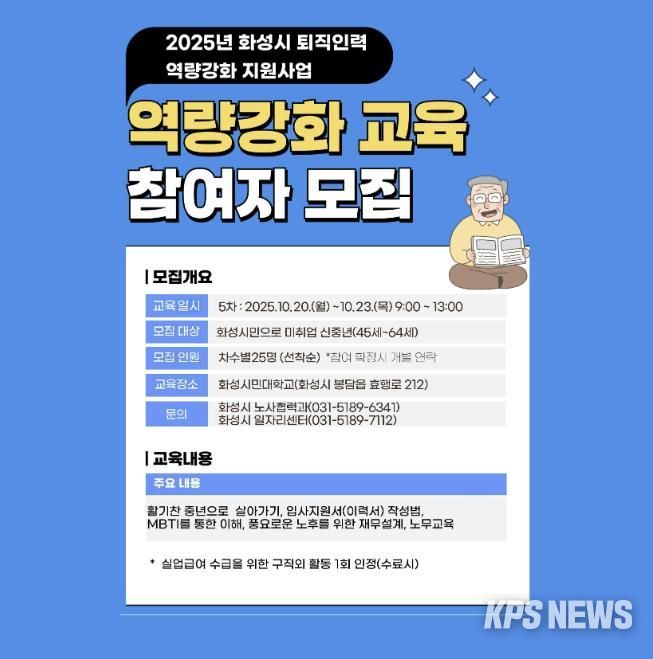 KPSNEWS 김채경 기자 | 화성특례시가 퇴직 인력의 사회 재진출과 노후 준비를 돕기 위한 ‘역량강화 교육’ 5기 참여자를 모집한다고 24일 밝혔다.