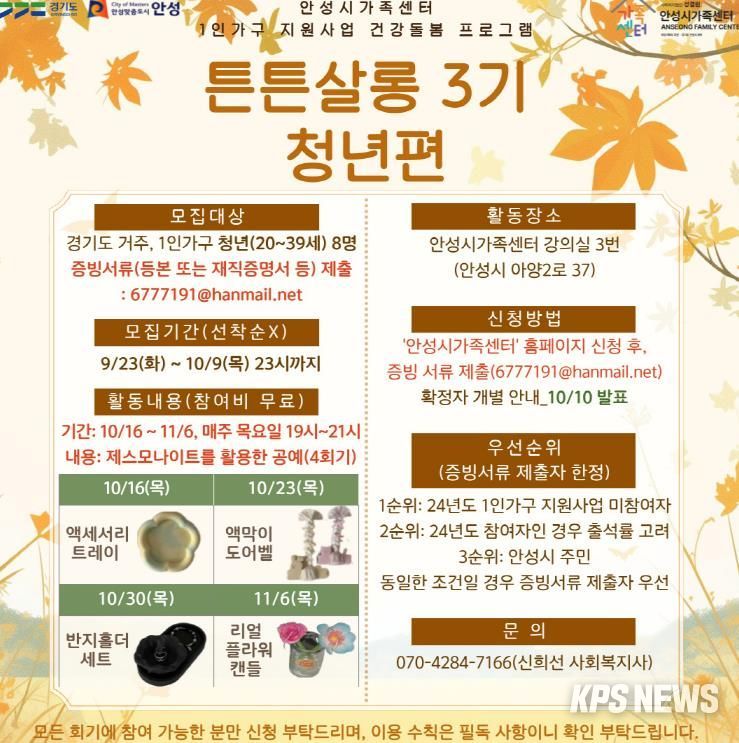 KPSNEWS 김채경 기자 | 안성시가족센터는 1인 가구 청년층을 대상으로 ‘건강돌봄 프로그램 – 튼튼살롱 3기’ 참여자를 모집한다.