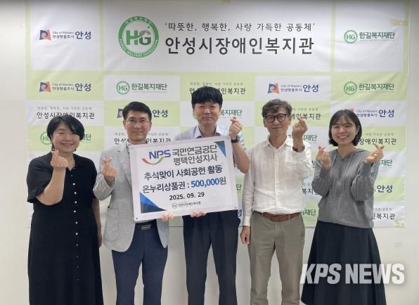 KPSNEWS 김채경 기자 | 사회복지법인 한길복지재단에서 수탁하고 있는 안성시장애인복지관은 지난 9월 29일 국민연금공단 평택안성지사로부터 사회공헌활동으로 50만원 상당의 온누리 상품권을 후원받았다고 밝혔다.
