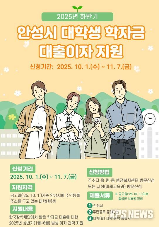 KPSNEWS 김채경 기자 | 안성시는 오는 10월 1일부터 11월 7일까지 ‘2025년도 하반기 안성시 대학생 학자금 대출이자’ 지원 신청을 받는다.