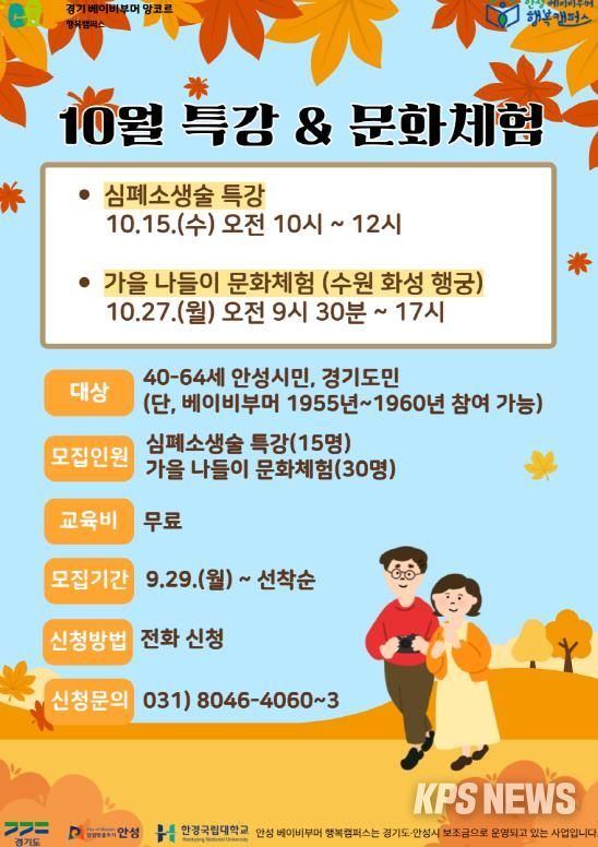 KPSNEWS 김채경 기자 | 안성 베이비부머 행복캠퍼스(한경국립대학교 평생교육원)는 오는 10월 15일부터 27일까지 중장년 안성시민(경기도민)을 대상으로 ‘10월 특강(심폐소생술) 및 문화체험(수원화성행궁)’ 프로그램을 운영한다고 밝혔다.