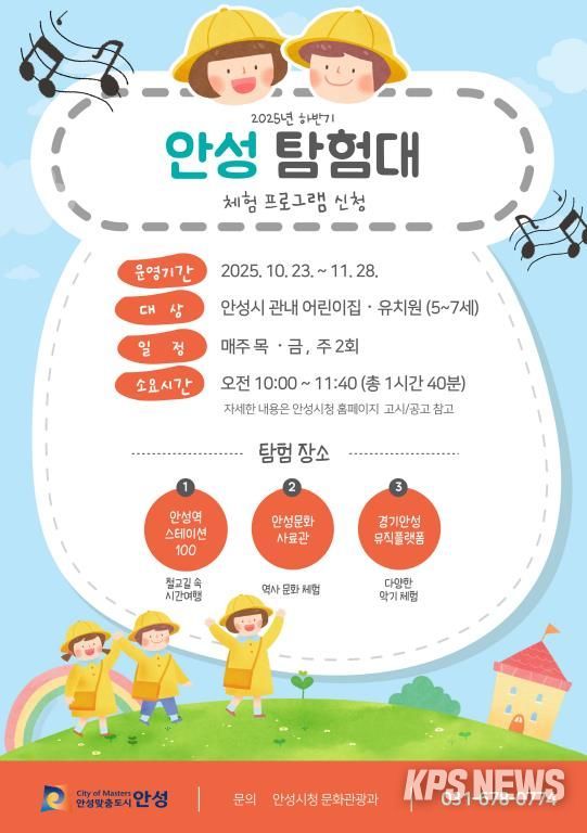 KPSNEWS 김채경 기자 | 안성시는 상반기에 시범 운영해 큰 호응을 얻은 유아 대상 체험형 프로그램 ‘안성 탐험대: 역사 속으로, 음악 속으로!’를 하반기에도 운영하며, 지역 문화시설 활성화에 나선다.