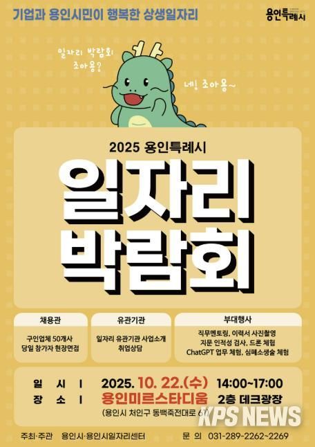 KPSNEWS 김채경 기자 | 용인특례시는 오는 22일 오후 2시부터 5시까지 용인미르스타디움 2층 덱(deck) 광장에서 2025년 하반기 일자리박람회를 개최한다고 17일 밝혔다.