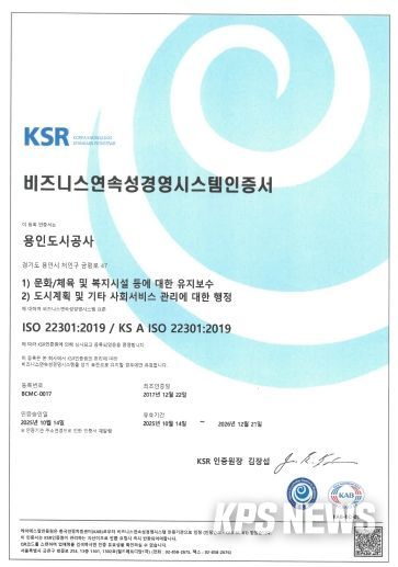KPSNEWS 김채경 기자 | 용인도시공사는 지난 9월 29일부터 30일까지 진행된 ISO45001(안전보건경영시스템) 갱신심사 및 ISO22301(비즈니스연속성경영시스템) 사후관리심사에서 모두 ‘적합’ 판정을 받으며, 국제표준에 부합하는 안전관리체계를 지속적으로 유지하고 있음을 다시 한번 입증했다.