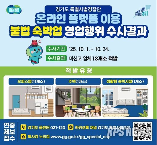KPSNEWS 김채경 기자 | 숙박업 신고 없이 오피스텔, 주택 등에서 영업을 한 불법 숙박업체 13곳이 경기도 특별사법경찰단 수사에 적발됐다.