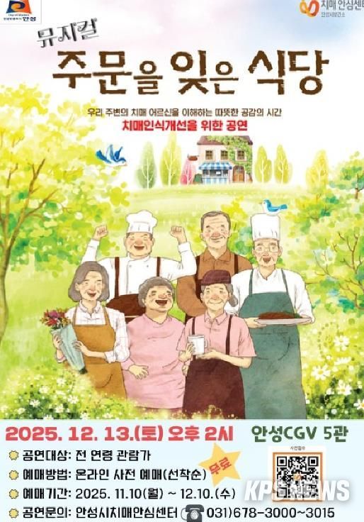 KPSNEWS 김채경 기자 | 안성시보건소 치매안심센터는 오는 12월 13일 오후 2시, 안성 CGV에서 치매에 대한 올바른 이해와 공감 확산을 위한 치매인식개선 뮤지컬 '주문을 잊은 식당'공연을 무료로 개최한다.