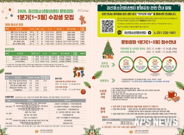 KPSNEWS 김채경 기자 | 수원시청소년청년재단 권선청소년청년센터는 오는 1월 6일부터 3월 27일까지 지역사회 평생학습 문화강좌 1분기(1~3월) 수강생을 모집한다.