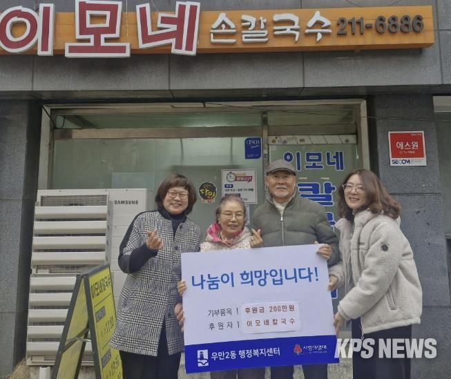 KPSNEWS 김채경 기자 | 수원시 팔달구 우만2동은 지난 23일, 이모네칼국수와 함께 이웃나눔 후원금 전달식을 진행했다고 밝혔다.