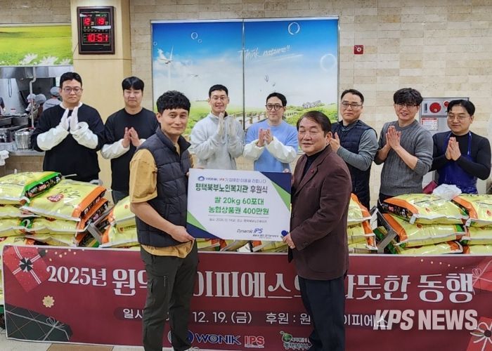 KPSNEWS 김채경 기자 | 원익IPS는 12월 19일, 평택북부노인복지관에 쌀 20kg 60포와 온누리 상품권 4,000,000원을 기부하며 따뜻한 나눔을 실천했다. 이번 전달식은 지역사회 나눔 문화 확산에 앞장서 온 원익IPS의 꾸준한 사회공헌 활동의 일환으로, 지역 내 어르신들에게 실질적인 도움을 주기 위한 의미있는 기부로 진행됐다.