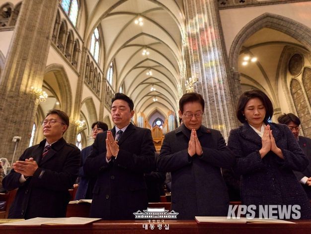 KPSNEWS 김채경 기자 | 이재명 대통령과 김혜경 여사가 25일 서울 중구 명동대성당에서 열린 성탄 대축일 미사에서 기도를 하고 있다.