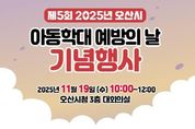 KPSNEWS 김채경 기자 | 오산시는 오는 19일 ‘아동학대예방의 날’과 ‘아동학대예방주간’을 맞아 기념행사 및 온·오프라인 캠페인을 실시한다고 12일 밝혔다. 행사는 19일 오전 10시부터 12시까지 오산시청 대회의실에서 진행되며, ▲1부 아동학대예방의 날 기념식 식전공연, 유공자 표창 시상, 퍼포먼스, ▲2부 부모교육 특별강연으로 구성된다. 특별강연은 리플러스 인간연구소 박재연 소장이 ‘부모를 위한 건강한 대화방법’을 주제로 진행한다. 매년 11월 19일은 아동학대 예방과 방지에 대한 사회적 관심을 높이기 위해 제정된 법정기념일로, 오산시는 매년 기념식과 강연, 캠페인 등을 통해 아동학대 예방의 중요성을 알리는 다양한 활동을 추진해오고 있다. 시는 이달 25일까지 온라인 릴레이 캠페인도 함께 진행한다. 오산시민 누구나 SNS에 아동학대예방 메시지 또는 관련 사진을 업로드해 참여할 수 있다. 또한 11월 24일에는 시청 인근 주요 교차로에서 시민 대상 오프라인 홍보 캠페인을 실시해 아동학대 예방 인식 제고에 나설 예정이다. 박현주 아동복지과장은 “이번 행사가 아동학대 예방의 중요성을 되새기고 아