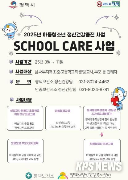 KPSNEWS 김채경 기자 | 평택시는 학교 내 정신건강 문제를 경험하는 아동·청소년의 증가에 따라 정신건강에 관심을 높이고 예방을 지원하기 위한 ‘School Care 사업’을 운영한다고 밝혔다.