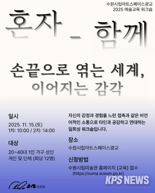 KPSNEWS 김채경 기자 | 경기도 수원시립미술관은 예술을 통해 타인과의 관계를 확장하고 감각을 회복하는 예술교육 워크숍 '혼자-함께'를 11월 15일 수원시립아트스페이스광교에서 개최한다.