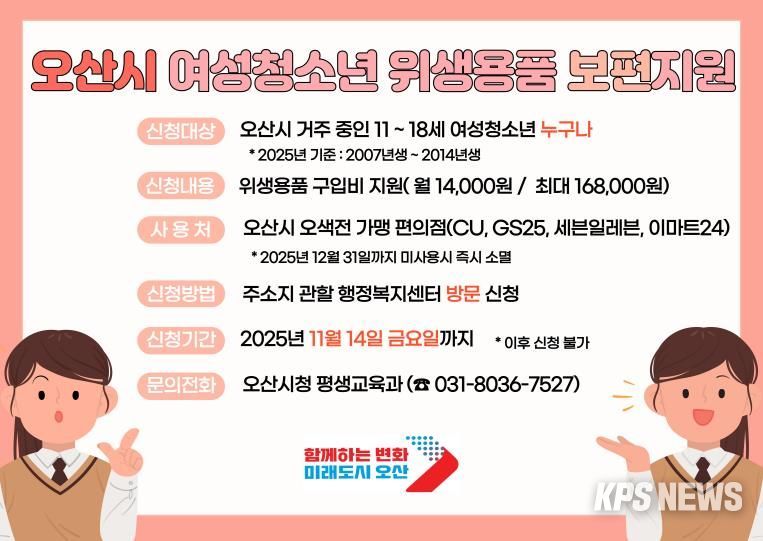 KPSNEWS 김채경 기자 | 오산시는 여성청소년의 건강권 보장과 보편적 복지 실현을 위해 올해 처음 시행한 ‘여성청소년 위생용품 보편지원사업’의 신청을 오는 11월 14일 마감한다. 아직 신청하지 않은 대상자는 혜택을 받을 수 있도록 서둘러 참여해야 한다.