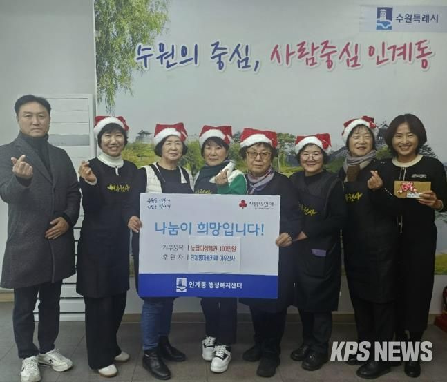 KPSNEWS 김채경 기자 | 지난 12월 15일, 수원시 팔달구 인계동은 마을 카페 ‘여우천사’에서 동 행정복지센터에 뉴코아상품권(총 100만 원 상당)을 기탁했다고 밝혔다.