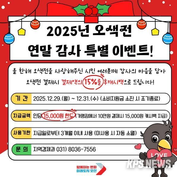 KPSNEWS 김채경 기자 | 오산시는 한 해 동안 지역화폐를 이용해 준 시민들에게 감사의 뜻을 전하고, 연말 소비 활성화를 도모하기 위해 ‘2025년 오색전 연말 감사 특별 이벤트’를 추진한다.