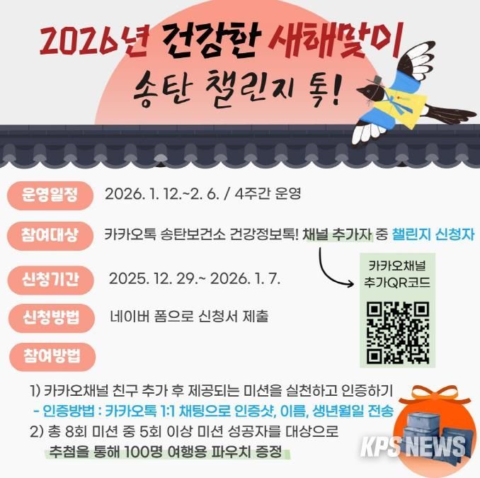 KPSNEWS 김채경 기자 | 평택시 송탄보건소는 12월 29일부터 2026년 1월 7일까지 건강한 새해맞이 ‘송탄 챌린지 톡!’1차 참여자를 모집한다고 밝혔다.