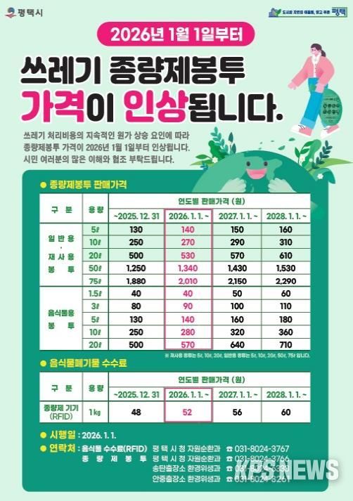 KPSNEWS 김채경 기자 | 평택시는 2026년 1월 1일부터 쓰레기 종량제 봉투 가격을 3개년도에 걸쳐 인상한다.