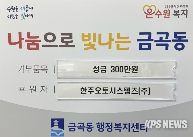 KPSNEWS 김채경 기자 | 지난 29일 수원시 권선구 금곡동 행정복지센터는 한주오토시스템즈(주)로부터 저소득 가정을 지원하기 위한 성금 300만 원을 전달받았다고 밝혔다.