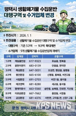 KPSNEWS 김채경 기자 | 평택시는 도시환경 변화와 인구증가에 따른 생활폐기물 처리 수요 증가에 대응하기 위해 생활폐기물 수집 운반 운영체계를 전면 개편한다고 밝혔다.