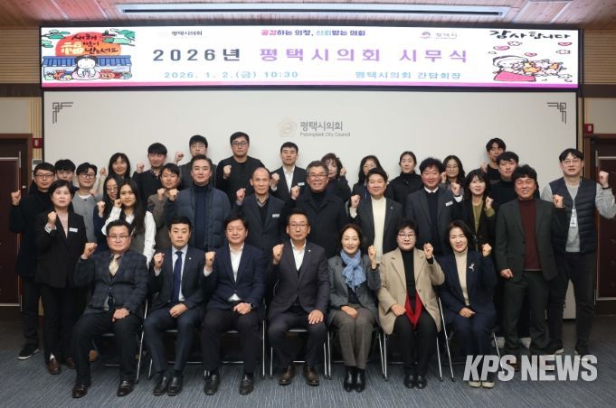 KPSNEWS 김채경 기자 | 평택시의회는 2일, 시의회 간담회장에서 의원 및 의회사무국 직원 등 60여 명이 참석한 가운데 2026년 시무식을 가졌다.