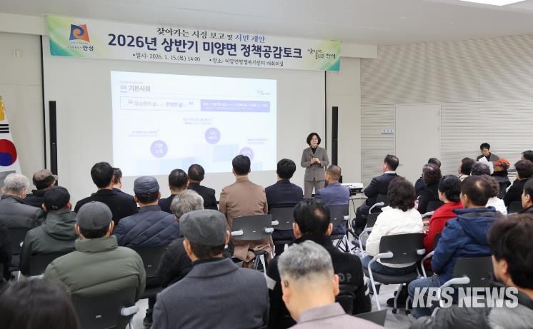 KPSNEWS 김채경 기자 | 안성시 미양면은 지난 1월 15일, 미양면행정복지센터 대회의실에서 주민 120여 명이 참석한 가운데 ‘2026년 상반기 미양면 정책공감토크’를 성황리에 개최했다.