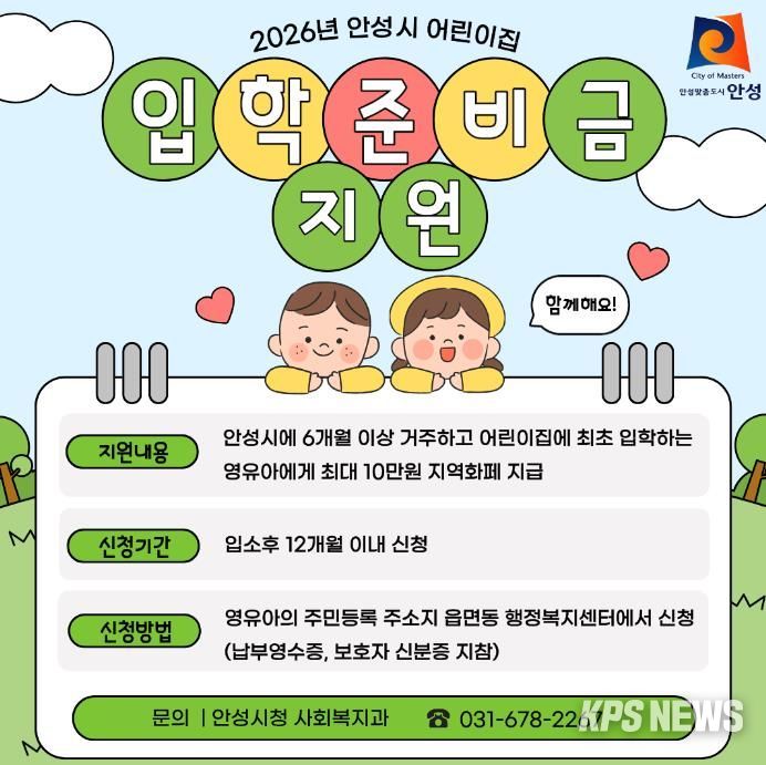 KPSNEWS 김채경 기자 | 안성시는 2026년부터 어린이집 입학준비금 지원사업을 시행한다고 밝혔다.