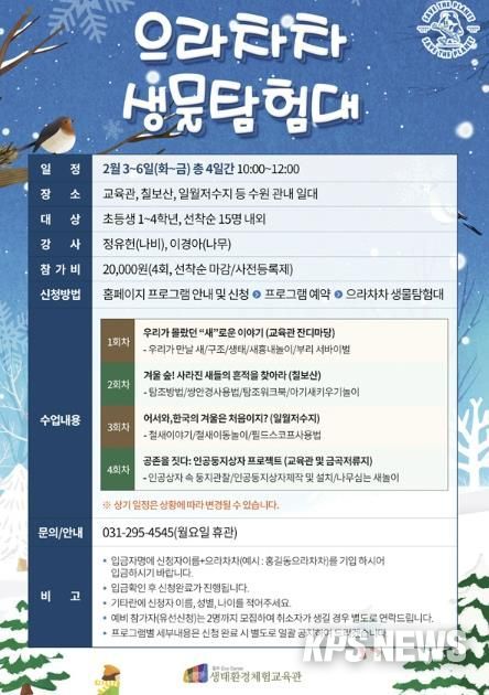 KPSNEWS 김채경 기자 | 칠보생태환경체험교육관이 겨울방학 프로그램 ‘으라차차 생물탐험대(겨울 탐조프로젝트)’에 참여할 초등학교 1~4학년 어린이 15명을 선착순으로 모집한다.