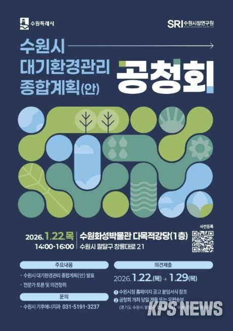 KPSNEWS 김채경 기자 | 수원특례시는 22일 오후 2시부터 4시까지 수원화성박물관 다목적강당에서 ‘수원시 대기환경관리 종합계획(안) 공청회’를 열고 시민 의견을 수렴한다.