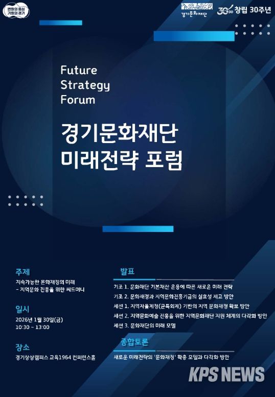 KPSNEWS 김채경 기자 | 경기문화재단(대표이사 유정주)은 창립 30주년(2027년)을 앞두고 재단의 미래 30년을 준비하기 위한 정책포럼으로 '경기문화재단 미래전략 포럼'을 오는 1월 30일, 경기상상캠퍼스 교육1964 컨퍼런스홀(수원)에서 개최한다.