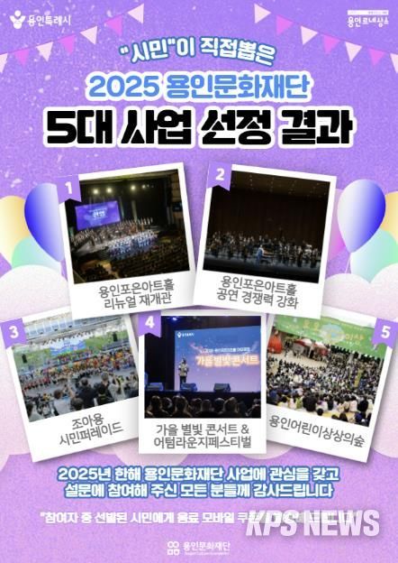 KPSNEWS 김채경 기자 | 용인문화재단은 시민 참여 온라인 투표를 통해 ‘시민이 선정한 2025년 용인문화재단 5대 사업’을 발표했다.