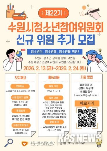 KPSNEWS 김채경 기자 | 수원시청소년청년재단(이사장 최종진)은 수원시 청소년의 정책 참여 확대와 권익 증진을 위해 '제22기 수원시청소년참여위원회' 위원을 추가 모집한다고 밝혔다.
