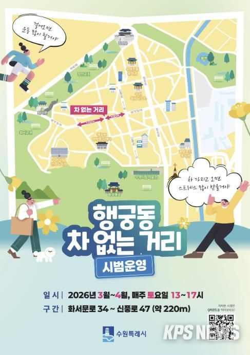 KPSNEWS 김채경 기자 | 수원특례시는 3월부터 4월까지 매주 토요일 화서문로 34번지부터 신풍로 47번지까지 220m 구간에서 ‘차 없는 거리’를 시범 운영한다.