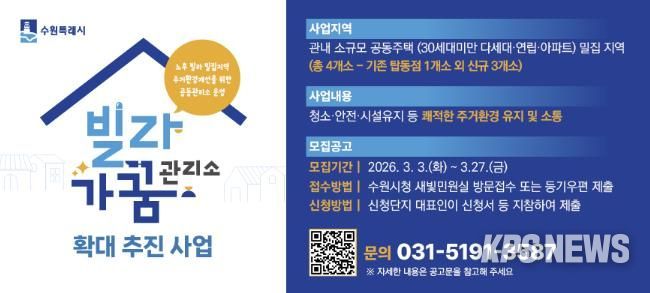 KPSNEWS 김채경 기자 | 수원특례시는 노후 빌라 밀집지역을 체계적으로 관리하고, 주거환경을 개선하는 ‘2026년 빌라가꿈관리소 확대 추진사업’의 대상지 신청을 3월 27일까지 받는다.