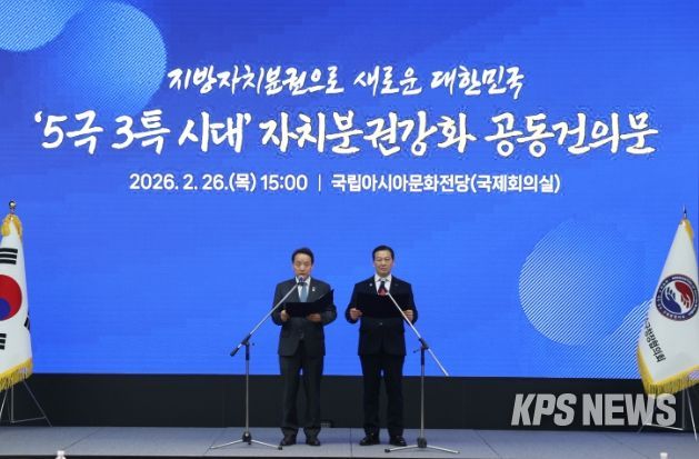 KPSNEWS 김채경 기자 | 대한민국시장·군수·구청장협의회는 2월 26일 광주 국립아시아문화전당에서 민선8기 4차년도 제3차 공동회장단회의를 개최하고,『5극3특 시대 자치분권 강화 공동건의문』을 발표했다.