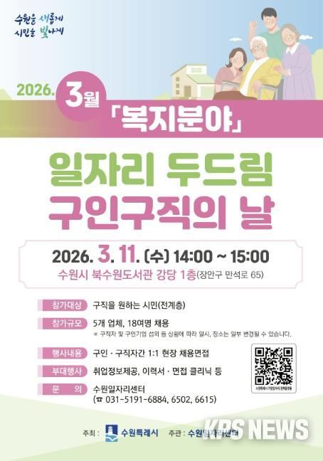 KPSNEWS 김채경 기자 | 수원특례시는 3월 11일 오후 2시부터 3시까지 북수원도서관 강당에서 ‘3월 일자리 두드림 구인·구직의 날’을 개최한다.