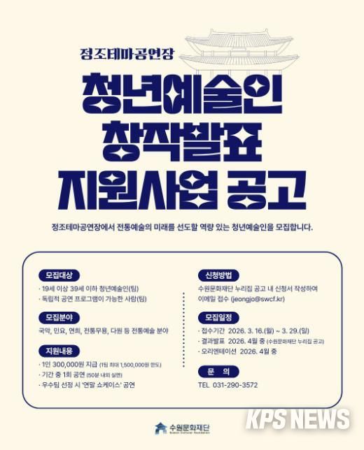 KPSNEWS 김채경 기자 | 수원문화재단 정조테마공연장은 오는 29일까지 ‘2026 정조테마공연장 청년예술인 창작발표 지원사업’에 참여할 청년예술인을 모집한다. 이번 사업은 전통예술 분야의 역량 있는 청년예술인을 발굴하고, 창작 활동의 기회를 제공하기 위해 마련했다.